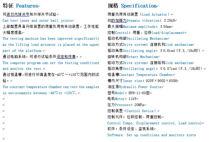 此裝置是給球關(guān)節(jié)施加負(fù)荷荷重、搖動(dòng)角、旋轉(zhuǎn)角,以評(píng)價(jià)其耐久性的裝置。