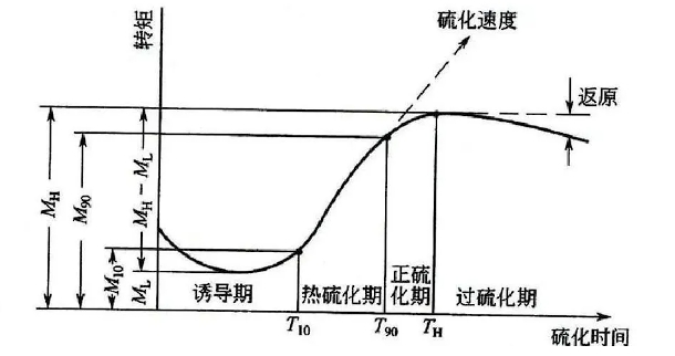 - 正硫化時(shí)間:正硫化時(shí)間可以通過硫化儀測(cè)試橡膠的硫化曲線得到。硫化曲線中通常包括焦燒時(shí)間(T10,指橡膠開始硫化的時(shí)間)、正硫化時(shí)間(T90,指橡膠性能達(dá)到最佳的硫化時(shí)間)等。