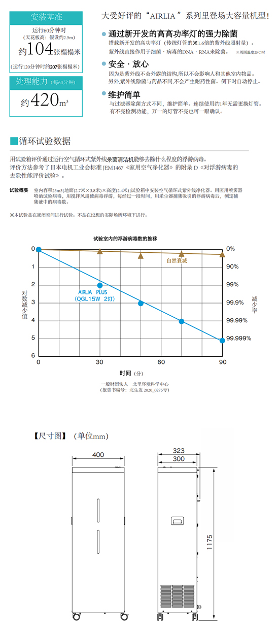 AIRLIA PLUS型號(hào)是對(duì)應(yīng)約420m³大空間的大容量類型,在用高功率的紫外線燈增加除菌力的同時(shí),保持靜音性的大容量機(jī)型。